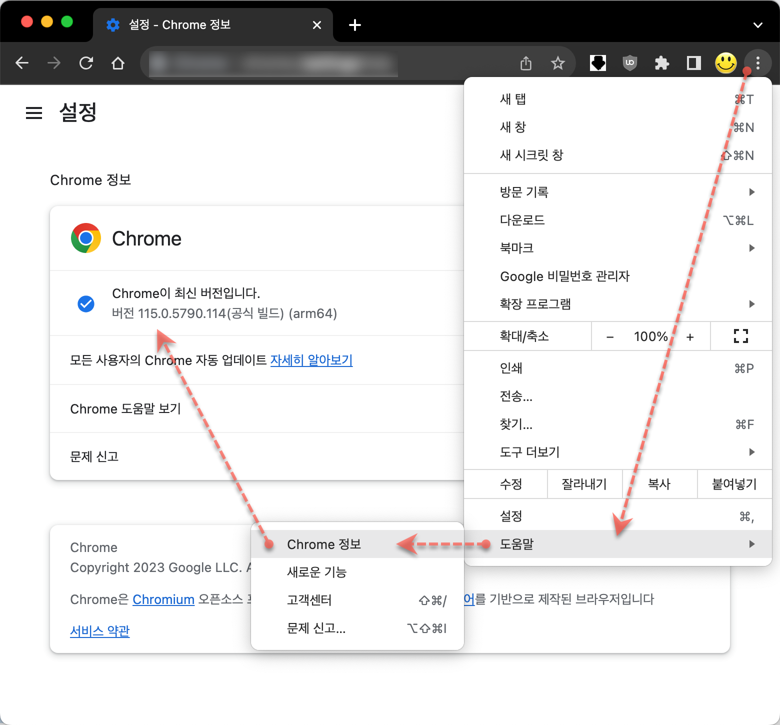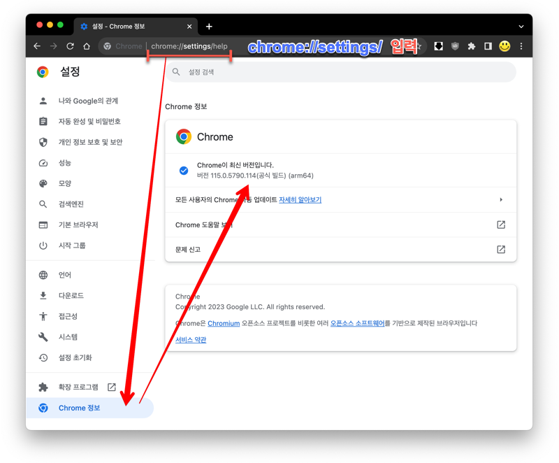 - 주소창에 "chrome://settings/help"를 입력하고 엔터를 누릅니다.
