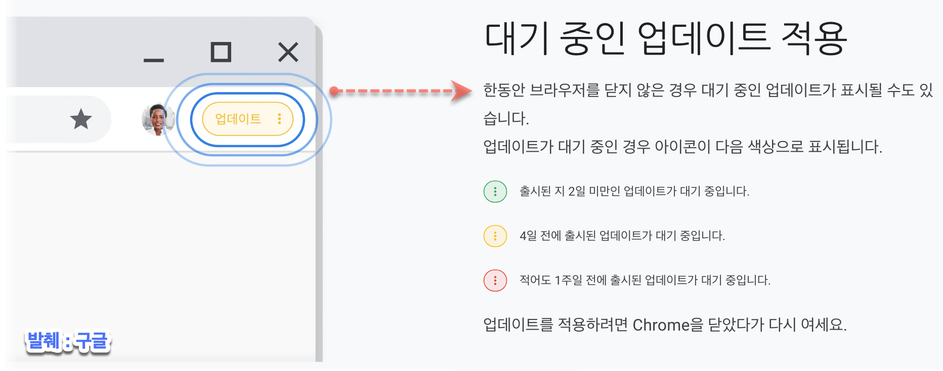 - 크롬 브라우저가 업데이트 가능한지 확인합니다. 업데이트가 필요하다면, 자동으로 업데이트가 시작됩니다.
